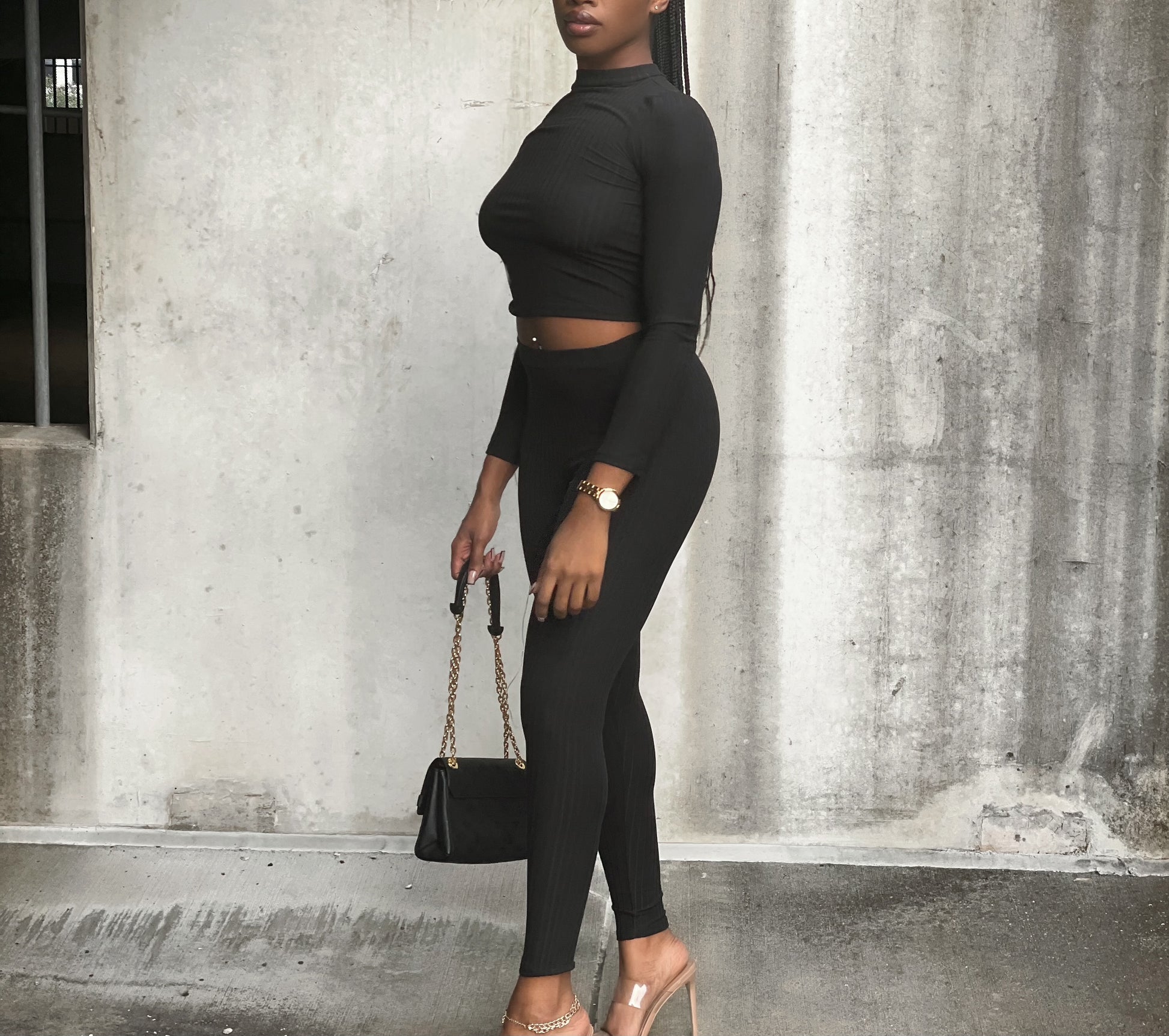 This set features our sleek leggings and matching top. Soft stretch material that holds and hugs your body tight in all the right places. High neckline with midriff baring style and single-lined long fitted sleeves. High waisted bottoms that accentuate your frame all the way down to your ankles. A timeless look with a sexy twist and can be worn as a set or separately.